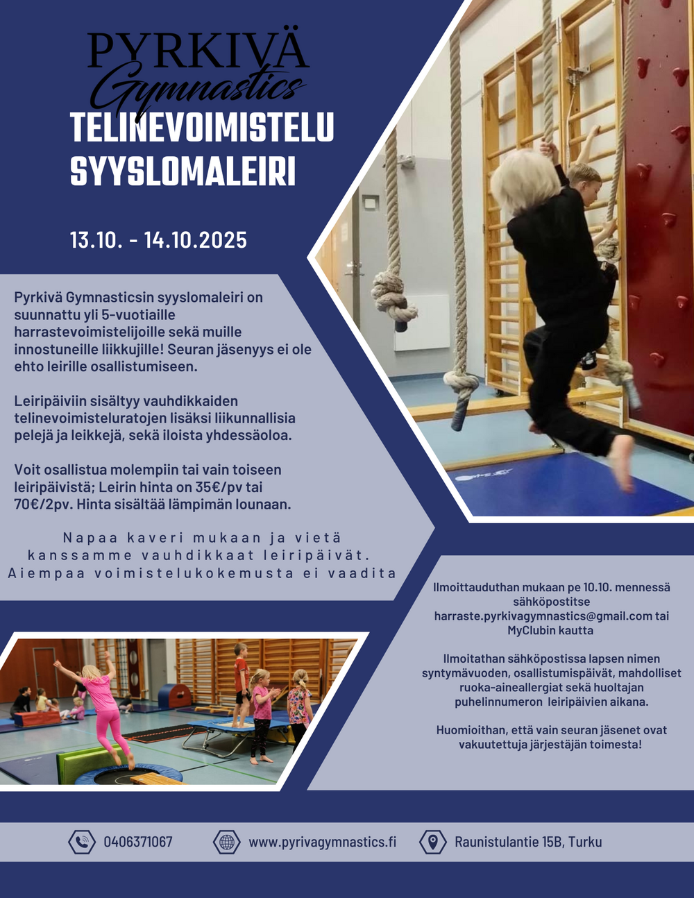Ilmoittautuminen syksyn telinevoimisteluryhmiin on nyt käynnissä! Olet lämpimästi tervetullut mukaan! Tutustu harrastetoiminnan ryhmätarjontaan sekä harjoitusaikatauluihin, ja VARAA OMA PAIKKASI NYT.