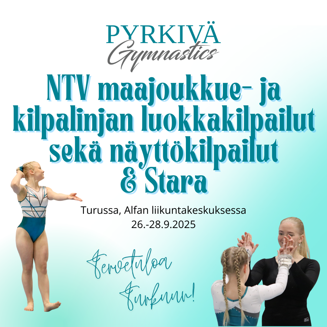 Pyrkivä Gymnastics järjestää NTV maajoukkue- ja kilpalinjan luokkakilpailut, NTV näyttökilpailut sekä telinevoimistelun Staran 26.-28.9., tervetuloa!