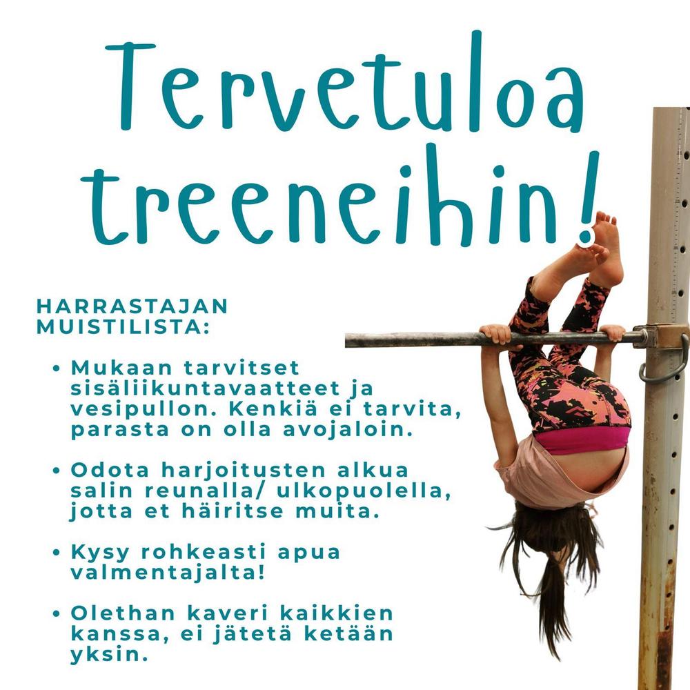 Ilmoittautuminen kevään 2026 telinevoimisteluryhmiin on nyt käynnissä! Olet lämpimästi tervetullut mukaan! Tutustu harrastetoiminnan ryhmätarjontaan sekä harjoitusaikatauluihin, ja VARAA OMA PAIKKASI NYT.