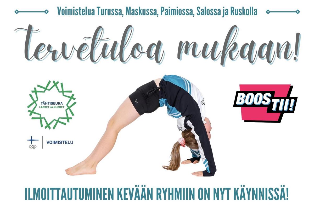 Tule liikkumaan hyvässä seurassa ja ilmoittaudu voimistelijaksi tästä! Tällä hetkellä ryhmämme harjoittelevat Turussa, Maskussa, Paimiossa, Salossa ja Ruskolla, ja tarjoamme eritasoisia telinevoimisteluryhmiä lapsille, nuorille ja aikuisille.