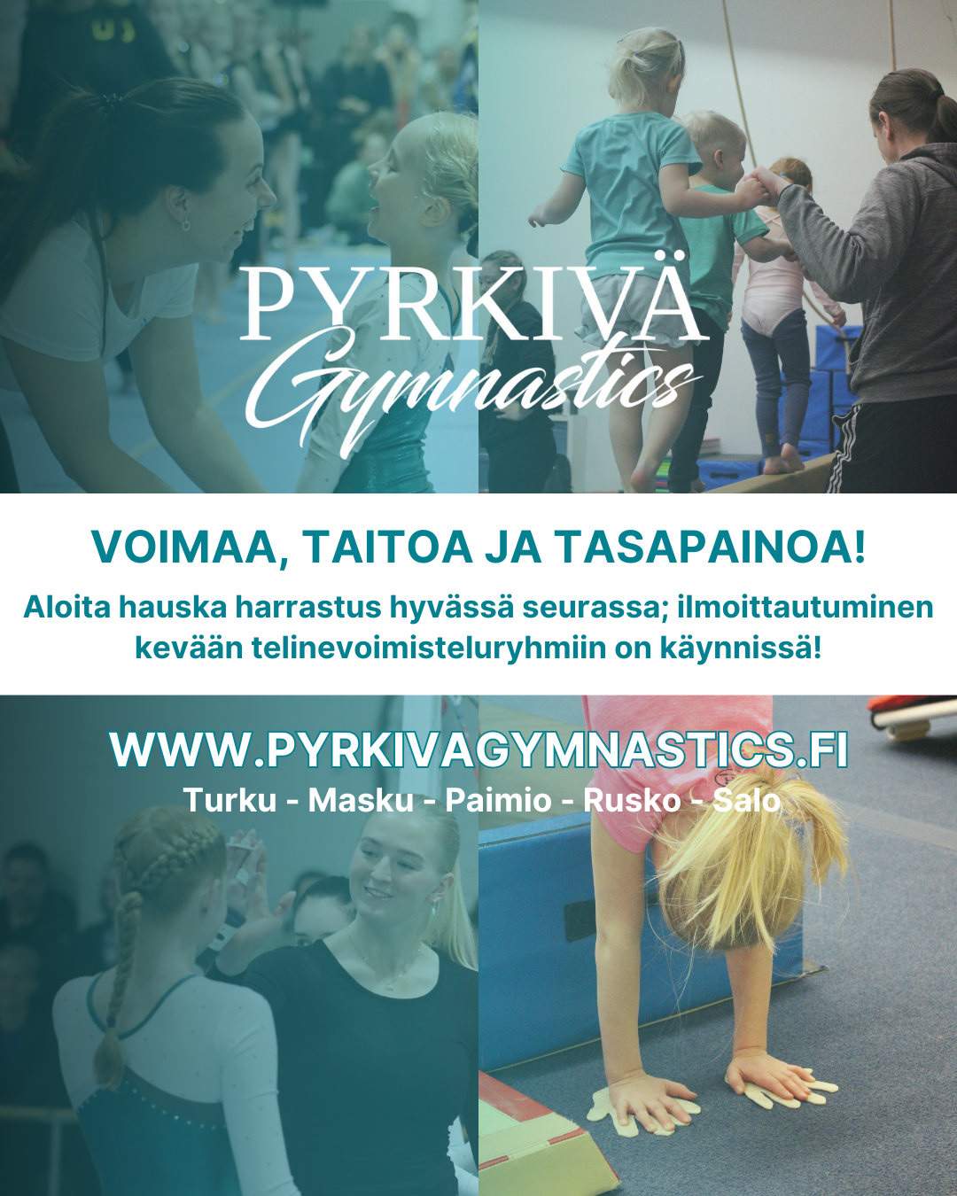 Tule liikkumaan hyvässä seurassa ja ilmoittaudu voimistelijaksi tästä! Tällä hetkellä ryhmämme harjoittelevat Turussa, Maskussa, Paimiossa, Salossa ja Ruskolla, ja tarjoamme eritasoisia telinevoimisteluryhmiä lapsille, nuorille ja aikuisille.