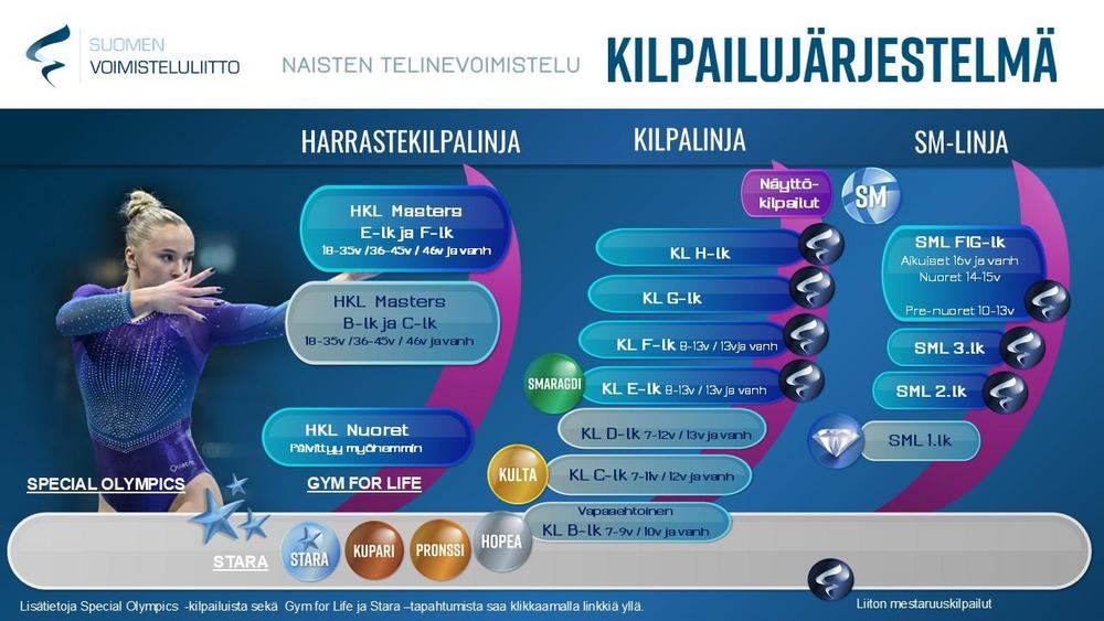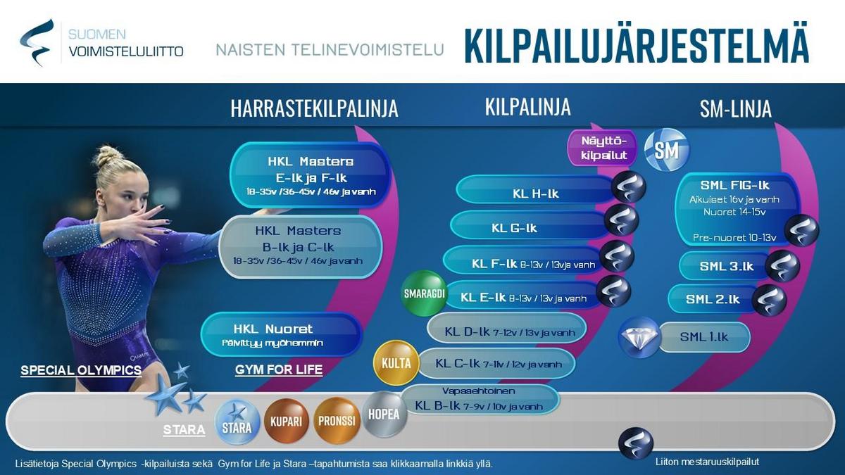 Hopeamerkin suoritettuaan voimistelija voi siirtyä kilpailemaan kilpalinjan B-luokkaan aikaisintaan sen vuoden syksynä, kun hän täyttää 7 vuotta. Kilpailuihin osallistumiseen vaaditaan kilpailulisenssi ja urheiluvakuutus.