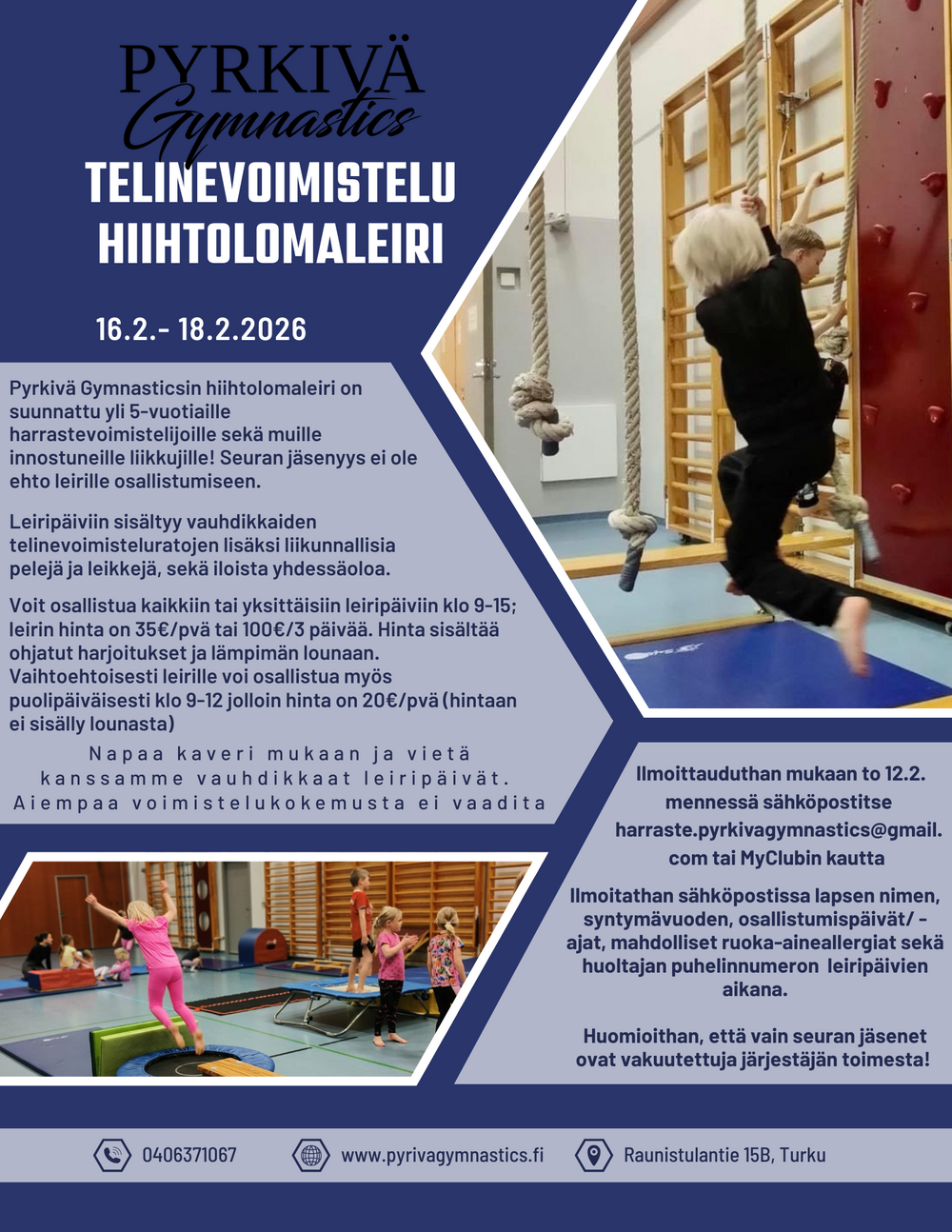 Kuittaathan osallistumisesi to 12.2.2026 mennessä. Kaikki ilmoittautumiset sähköpostitse osoitteeseen harraste.pyrkivagymnastics@gmail.com.