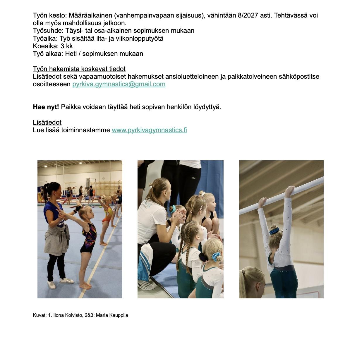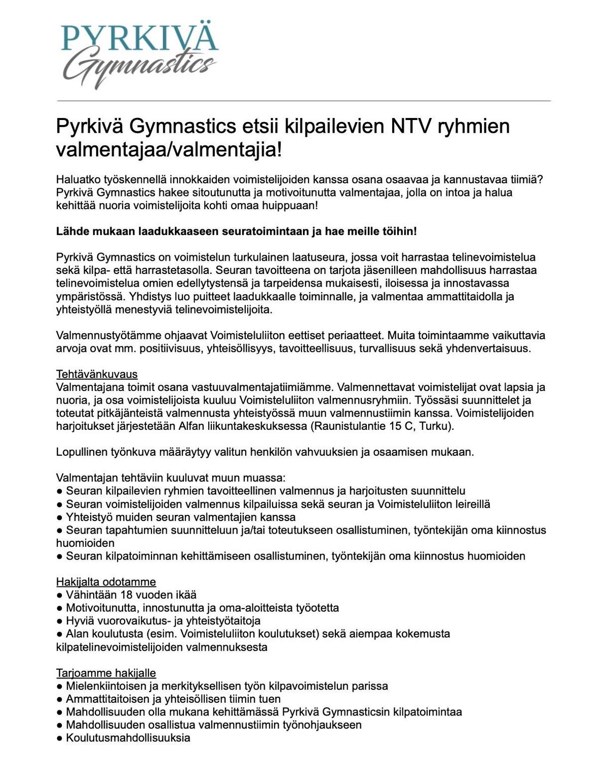 TÖITÄ TARJOLLA: Pyrkivä Gymnastics etsii kilpailevien NTV ryhmien valmentajaa!