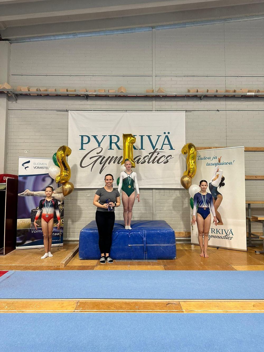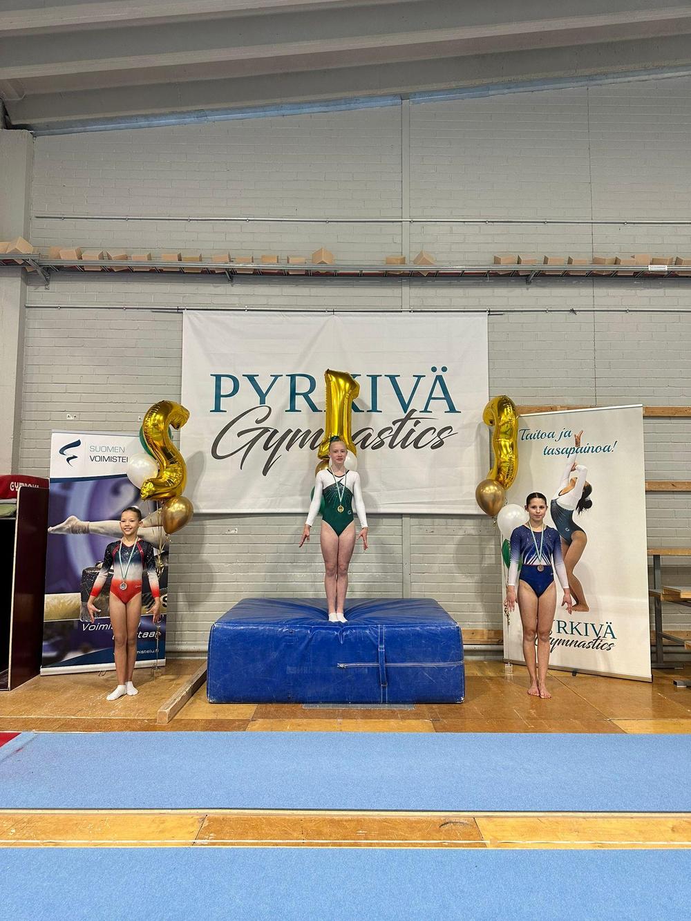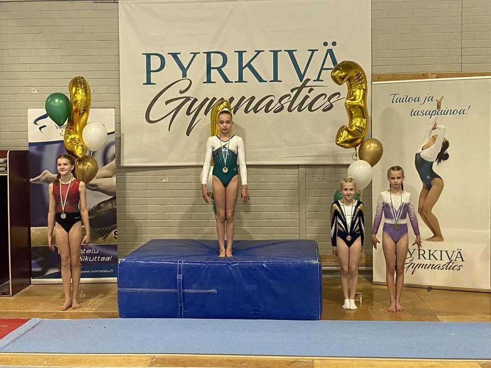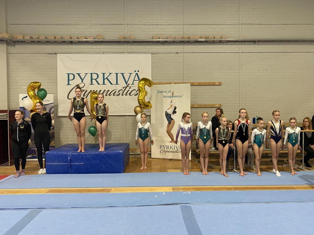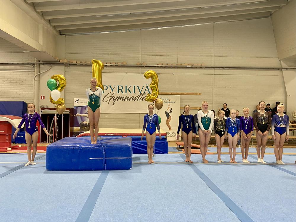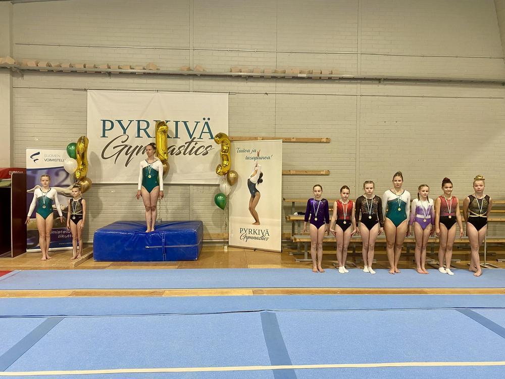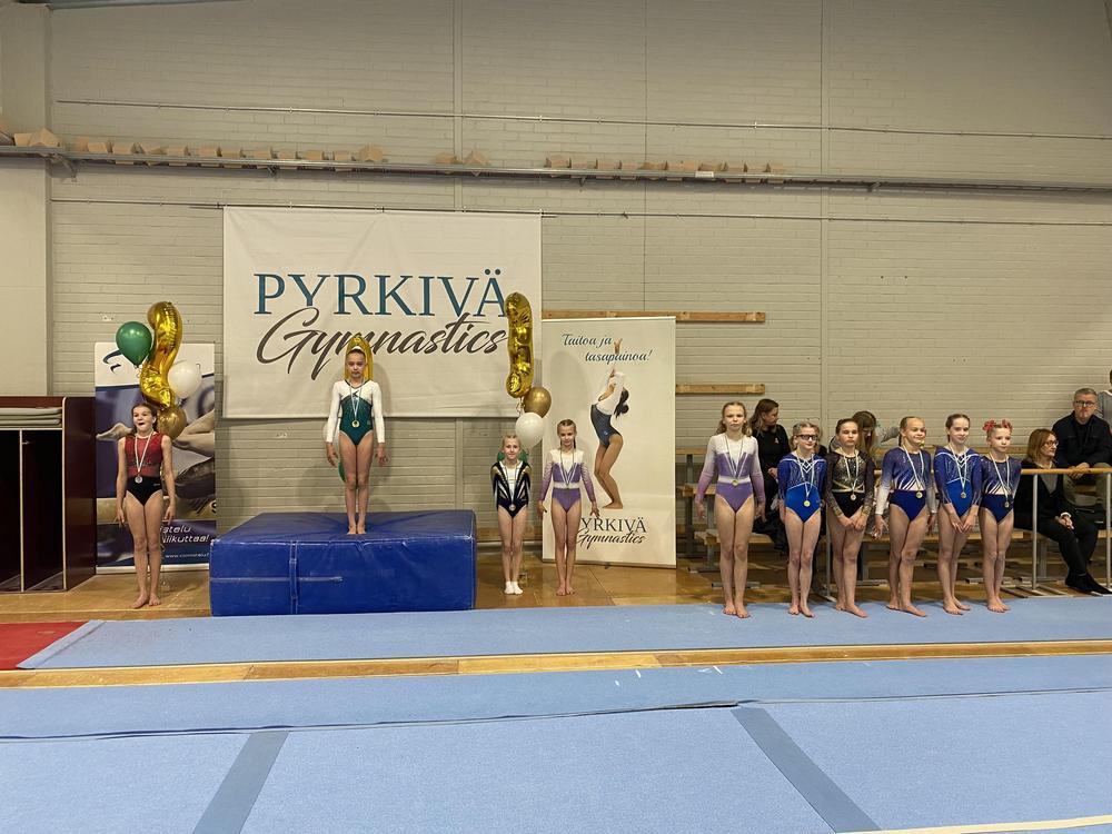 Pyrkiväläisiä nähtiin myös lauantai-illan tyttöjen näyttökilpailussa. Stiina Nikkola voimisteli hienosti sijalle 6 ja saavutti kilpailuissa pisteet 41,050. Seuran toinen edustaja Milla Nurmikko osallistui ensimmäisiin näyttökilpailuihinsa, ja oli pisteillä 40,350 hienosti kisan 12.