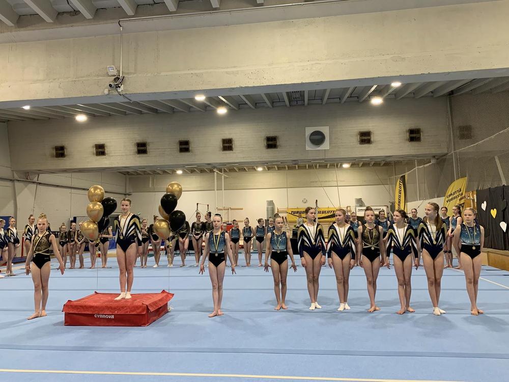 F-luokan 8-13v kilpailussa Iida Urponen saavutti suorituksillaan hienot neliottelupisteet 42,400 ja sai kaulaansa kultaisen mitalin. Sofia Laurila voimisteli hienosti pronssille pisteillä 40,900. Siiri Kuusela sijoittui neljänneksi ja Lilja Moisio viidenneksi. Telinekohtaisista kilpailuista Sofialle ja Iidalle jaettu hypyn voitto ja Iidalle nojapuiden kultaa. F-luokan +13v kisassa Ilona Salokannel taituroi kolmiottelun sijalle 5. Amanda Aalto voimisteli sijalle 8., Helmi Seppä sijalle 10., Manteli Kuusisto sijalle 11. ja Inna Silanterä sijalle 12. Amandalle nojapuiden kultaa!