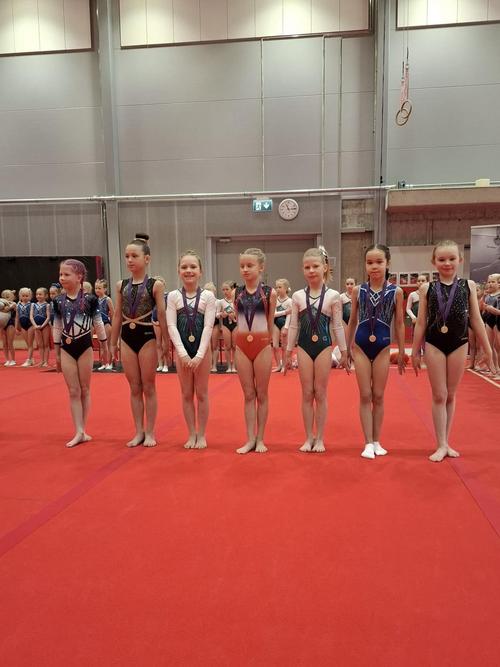 F-luokan nuoremmissa Luna Sinisalo taituroi neliottelun hopeaa (40,350)! Saara Kuusela oli pisteillä 39,783 viides, Ilona Salokannel pisteillä 38,983 yhdeksäs ja Sofia Laurila pisteillä 38,966 kymmenes. Telinekohtaisista kilpailuista Ilonalle upeasti hypyn kultaa ja Sofialle nojapuiden hopeaa. F-luokan vanhemmissa Amanda Aalto taituroi neliottelun sijalle 24 (36,650).