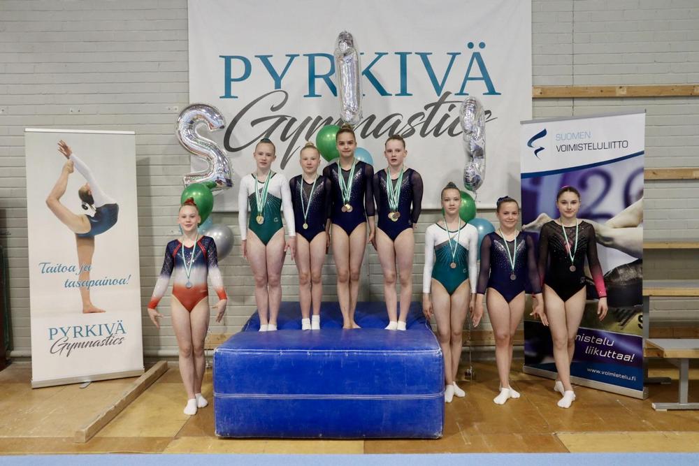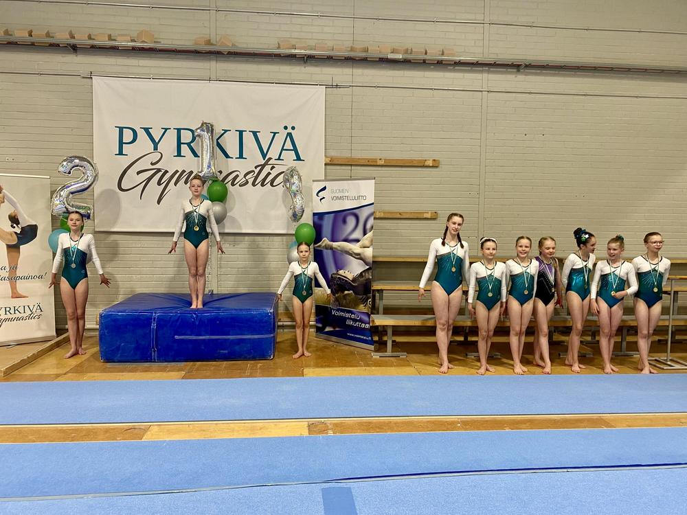 D-luokan vanhemmissa Olivia Uutela voimisteli upeasti kultaa ja Cecilia Iljamo nousi tyylikkäillä suorituksilla hopealle. Pyrkivä Gymnasticsin menestystä täydensivät Eveliina Hildenin kuudes ja Elina Immosen yhdeksäs sija. Kilpailussa nähtiin hienoja sarjoja myös Fiona Sundellilta, Manteli Kuusistolta ja Lauha Korhoselta.