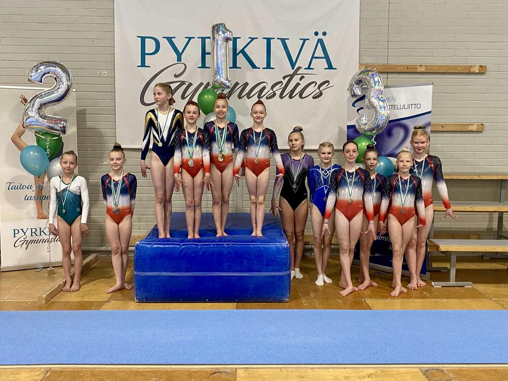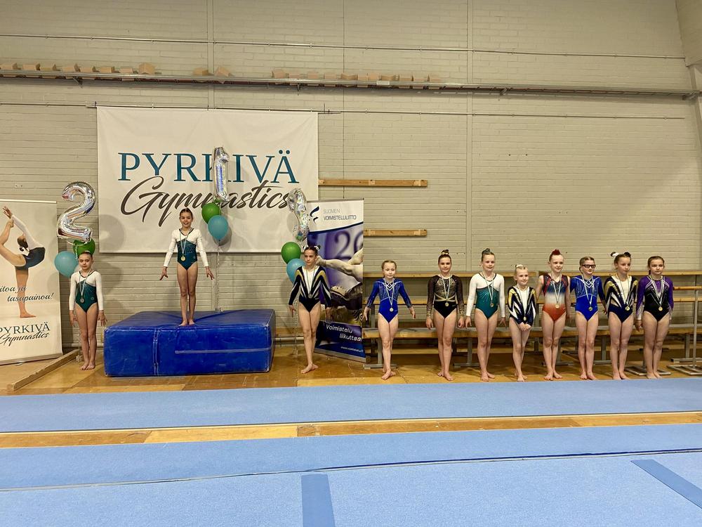 B-luokan nuoremmissa Aida Meriläinen taituroi VII kategorian pisteillä kovatasoisen kisan voittoon! Myös Lotta Matomäki ja Miana Harmanen yslivät huikeisiin suorituksiin; molemmat nappasivat kisasta VII kategorian pisteet, ja Lotta sijoittui hienosti kisan viideneksi ja Miana kuudeneksi. Nella Lehtonen nousi upeasti kymmenen parhaan joukkoon sijalle kahdeksan. Kilpailussa loistivat myös Linnea Granath, Hulda Harju, Sofia Joutsa, Inna Laaksonen, Emma Vuorsalo, Emmi Hyttinen sekä Mette Keskitalo.