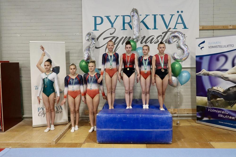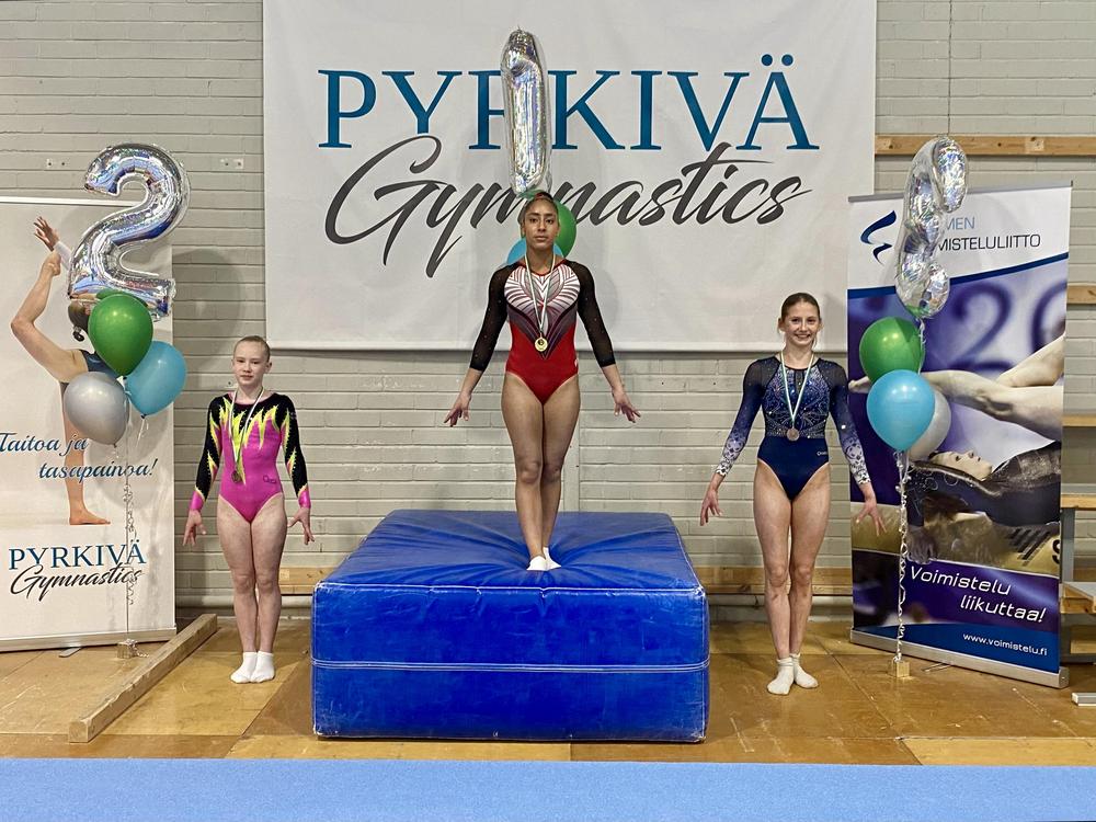 H-luokassa Alexandra Virko keräsi kolmelta telineeltä pisteet 32,300. Telinekohtaisista kilpailuista Alexandra nappasi upeasti hypyn ja permanon hopeaa.