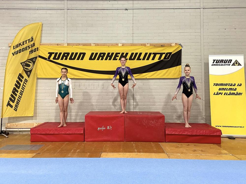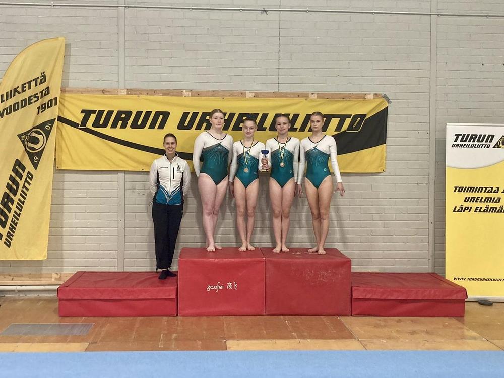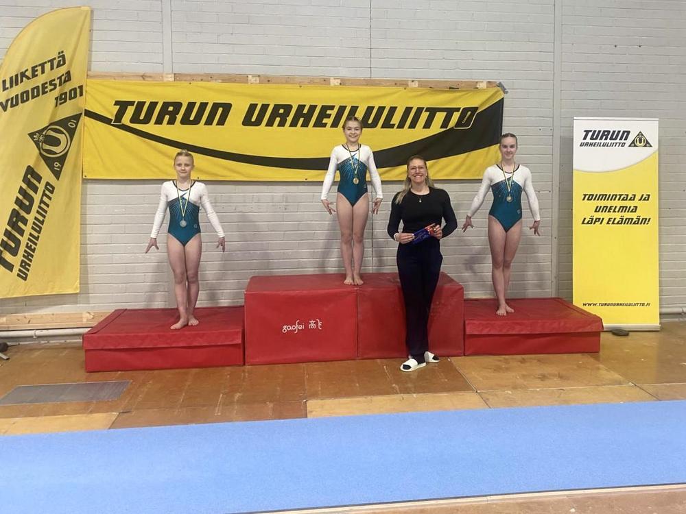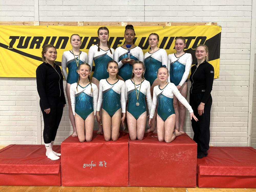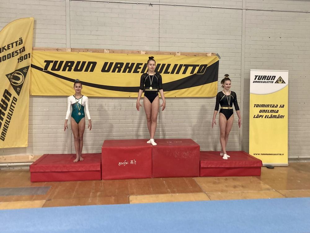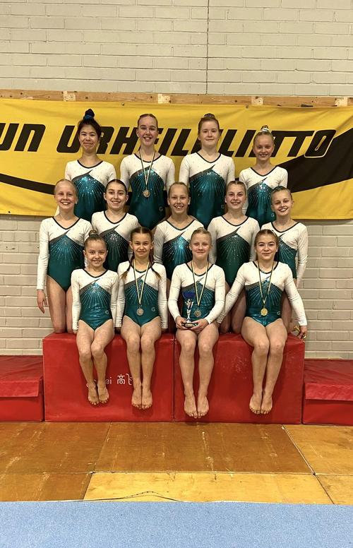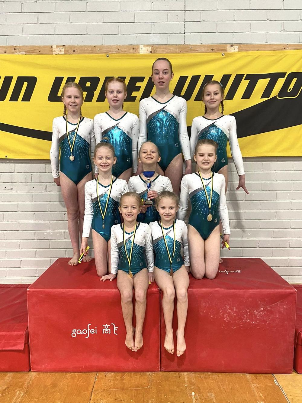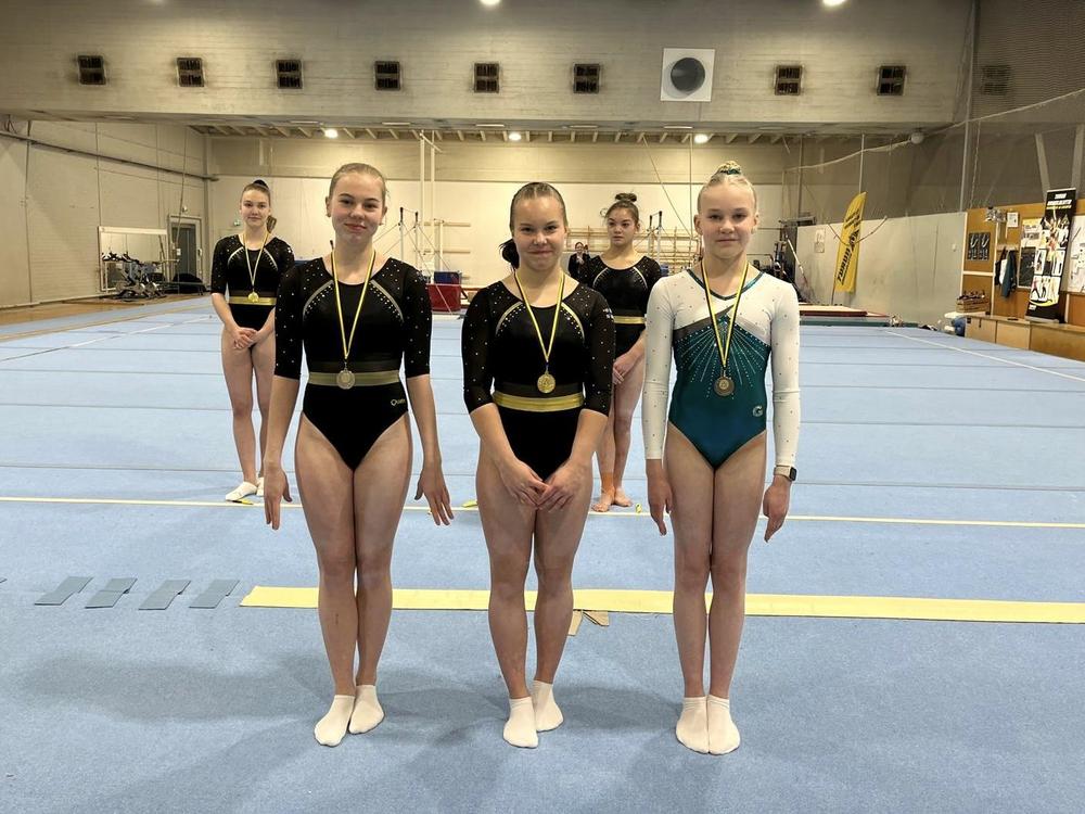 F-luokassa Isabella Kuzmanovski keräsi kasaan pisteet 42,850 ja voimisteli hienosti neliottelun pronssille! Venla Pajakkala nousi viidenneksi, Mette Lindroos kahdeksanneksi ja Selma Tanttu kymmenenneksi. Telinekohtaisissa kilpailuissa Venlalle upeasti nojapuiden pronssia ja Isabellalle puomin ja permannon kultaa. Joukkuekisassa voimistelijamme nousivat hienosti pronssille!