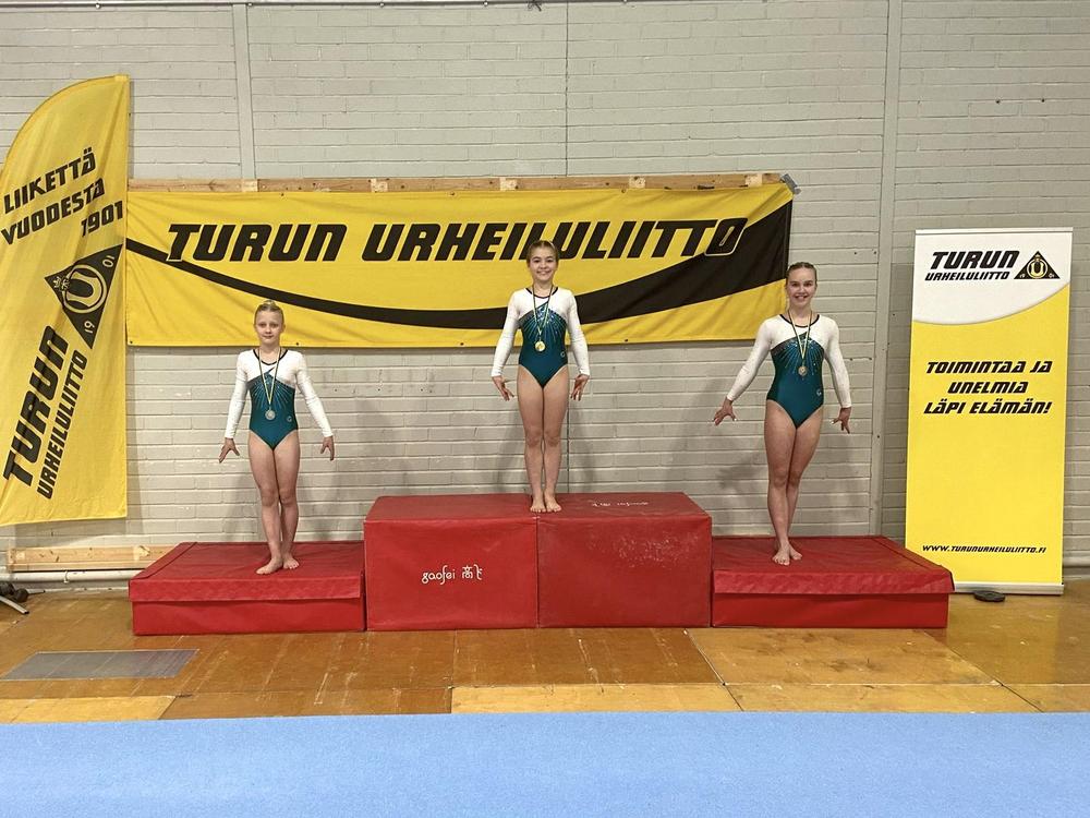 B-luokan nuoremmissa Pyrkivän voimistelijat nappasivat hienon kolmoisvoiton! Aava Kiviniemi taituroi tyylikkäillä suorituksillta kultaa, Essi Suomi voimisteli hopealle ja Aida-Elma Tammila pronssille. Kymmenen parhaan joukkoon voimistelivat myös sijalle 5 noussut Mila Meriläinen ja sijalle 9 voimistellut Unna Rauhansuu. B-luokan vanhemmissa Liina Hallamaa oli hienosti kisan viides, Aina Rauhansuu kuudes ja Eevi Aaltonen yhdeksäs. Joukkueena B-luokan tähdet nappasivat kultaa!