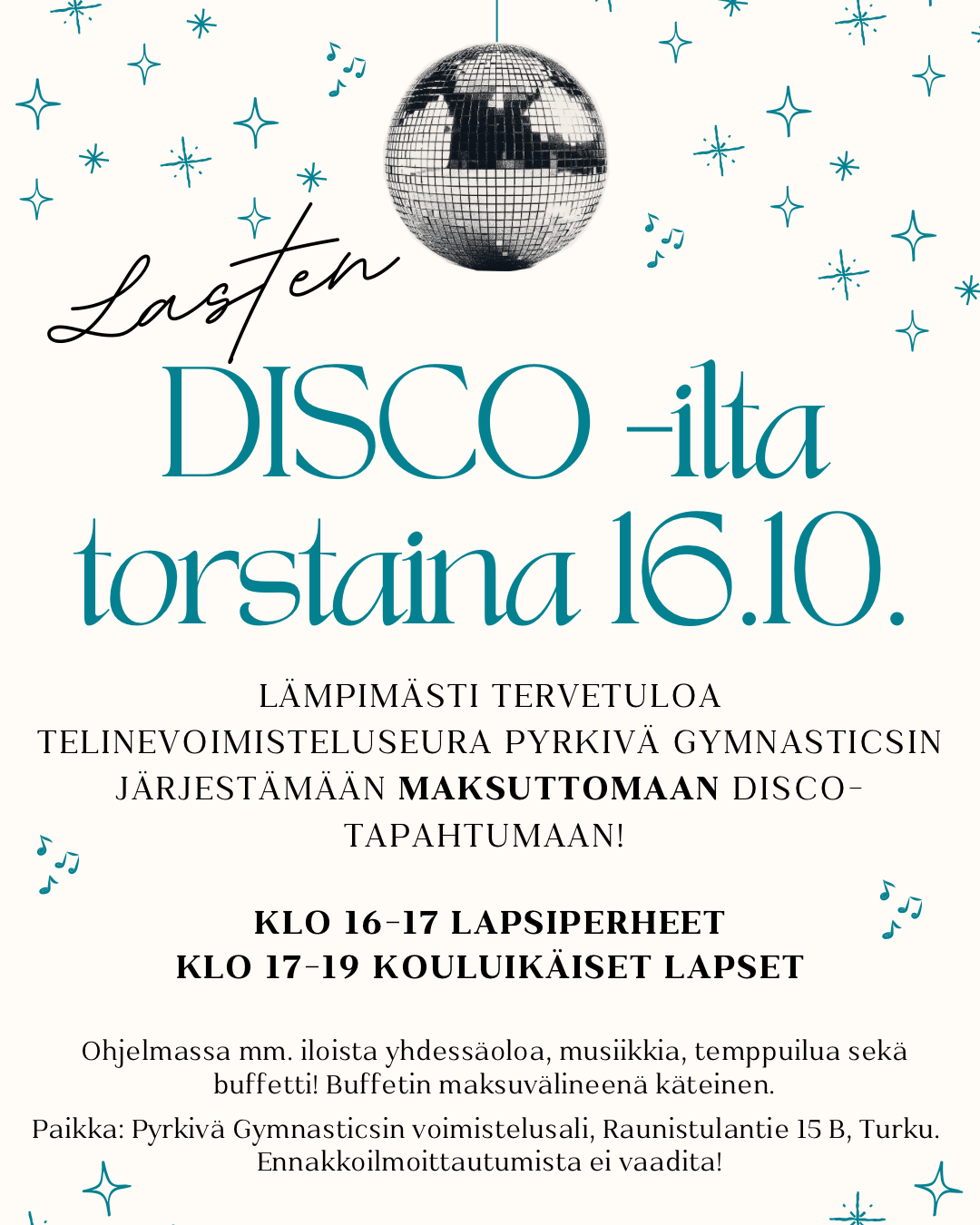 Torstaina 16.10. puetaan discovaatteet päälle! Klo 16-17 järjestetään lapsiperheiden maksuton discotapahtuma, ja klo 17-19 vuoroon pääsevät kouluikäiset lapset! Tapahtumaan on vapaa pääsy! Discossa myös buffetti, varaa käteistä mukaan pieniä herkkuja varten ;)
